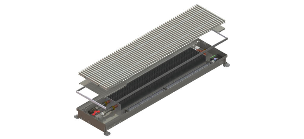 In der Regel wird ein Fussbodenkonvektor mit oder ohne Gebläse mit warmem Heizungswasser durchströmt. Dieses gibt die Wärme über den Wärmetauscher an den Raum ab.
